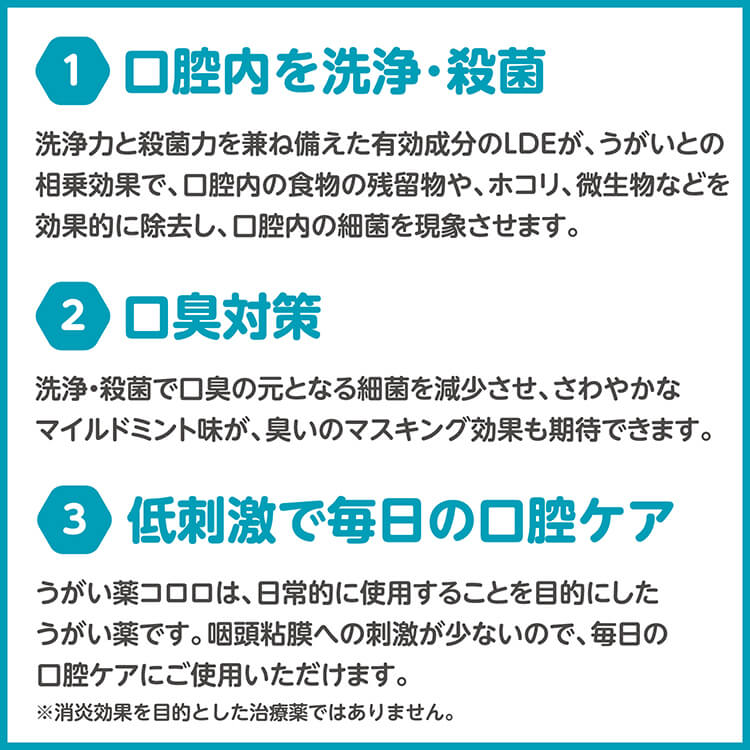 うがい薬コロロは、日常的に使用することを目的にしたうがい薬です。咽頭粘膜への刺激が少ないので、毎日の口腔ケアにご使用いただけます。