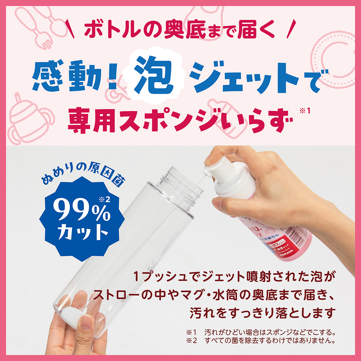 水洗いだけでは、ぬめりの原因となる雑菌を十分に落とせません。泡ストローマグ洗いを使用することで、ぬめりの原因菌を99%除去します。*2