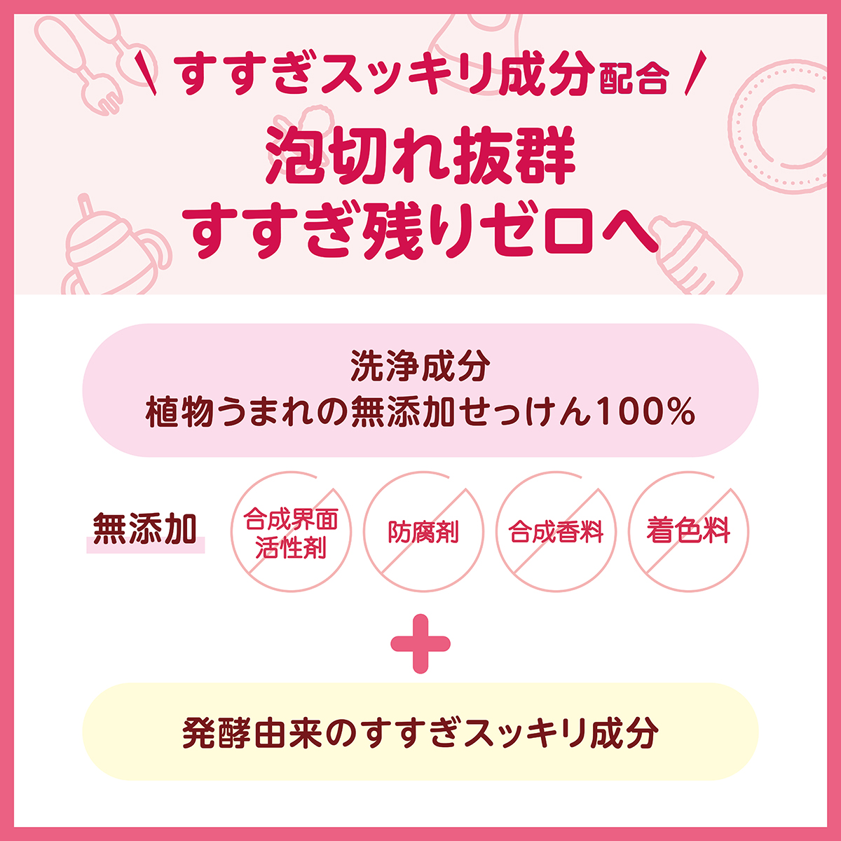また、無香なので匂い残りを気にせず赤ちゃんが直接口にするものにも安心してお使いいただけます。