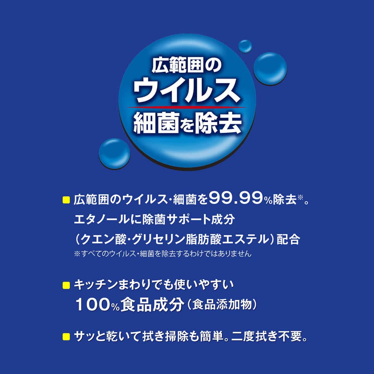 スプレー後の拭き取りや洗い流しは不要です。 ・キッチンやレンジ台、冷蔵庫内、食卓などはスプレーした後、ふきん等で拭き取ってください。二度拭きは不要です。 |