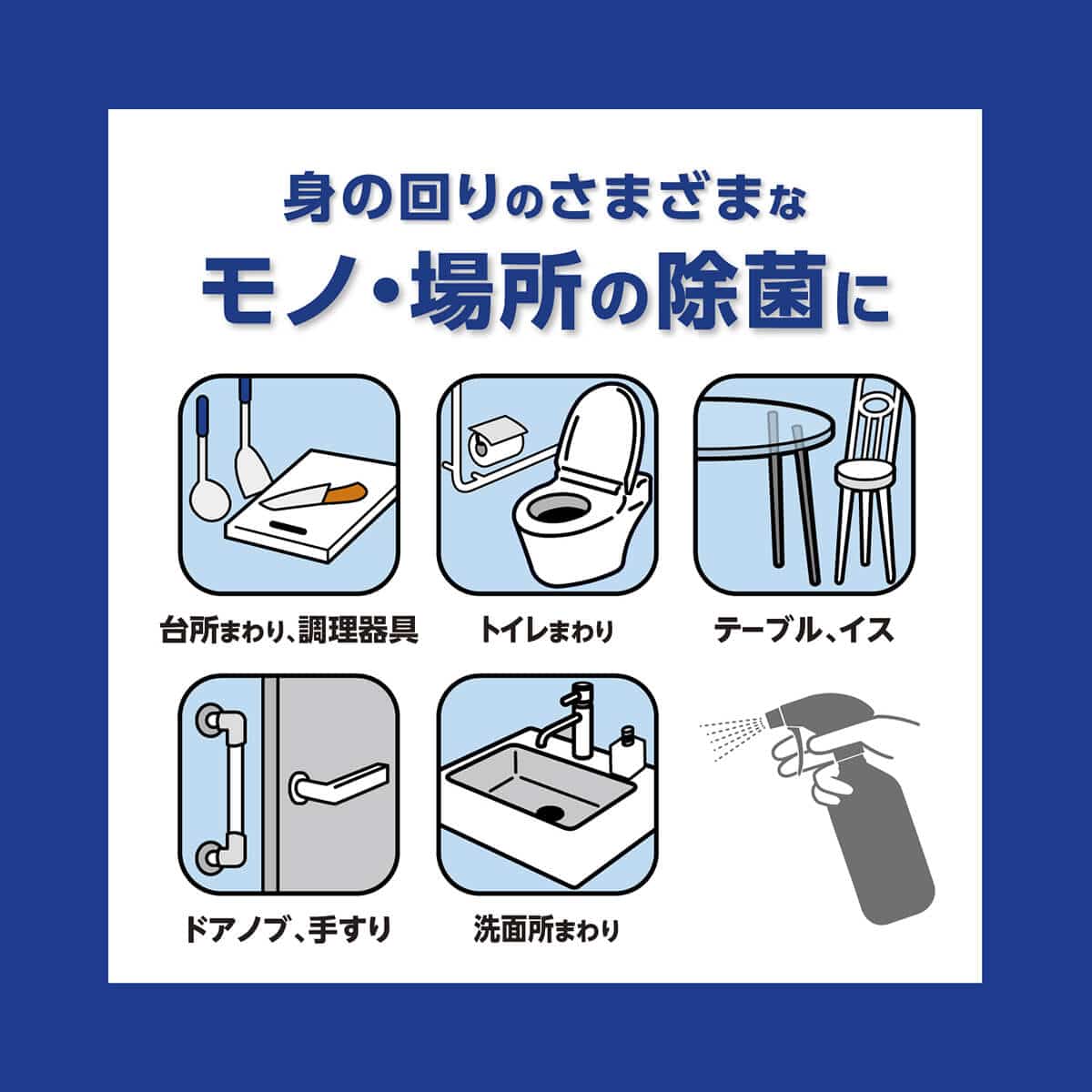 | 使用方法 | ・食品や調理器具(まな板、包丁など)、三角コーナーなどはそのままスプレーしてください。