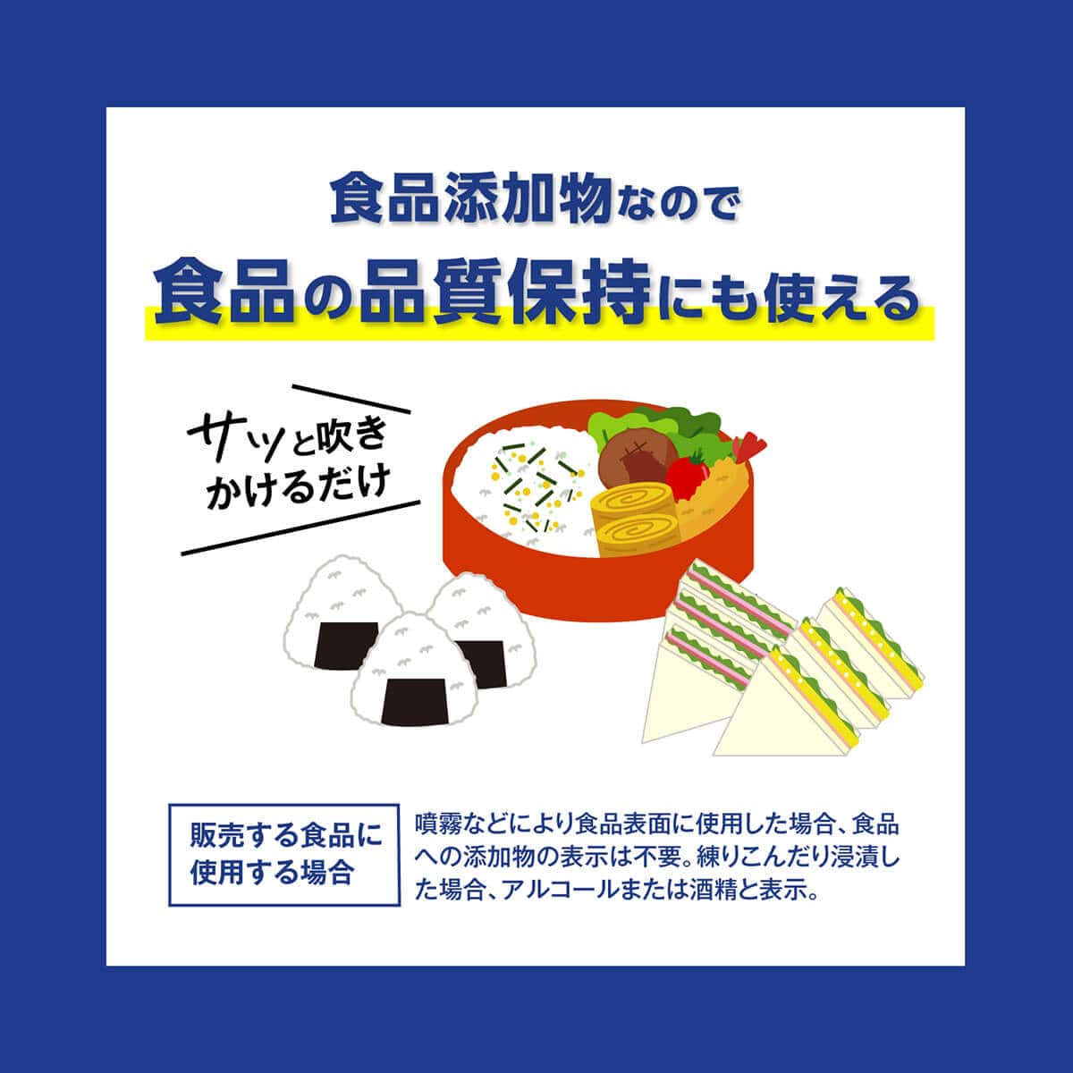 ・噴霧などにより食品表面に使用した場合、食品への添加物の表示は不要。 ・練り込んだり浸漬した場合、アルコールまたは酒精と表示。 〔用途〕食品や調理器具の除菌、衛生維持 〔液性〕弱酸性 |