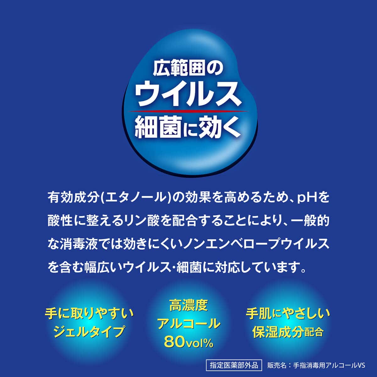 | 成分及び分量 | 有効成分としてエタノール(C2H6O)76.9~81.4vol%、添加物としてグリセリン、疎水化ヒドロキシプロピルメチルセルロース、ミリスチン酸イソプロピル、アラントイン、リン酸を含有する。 |