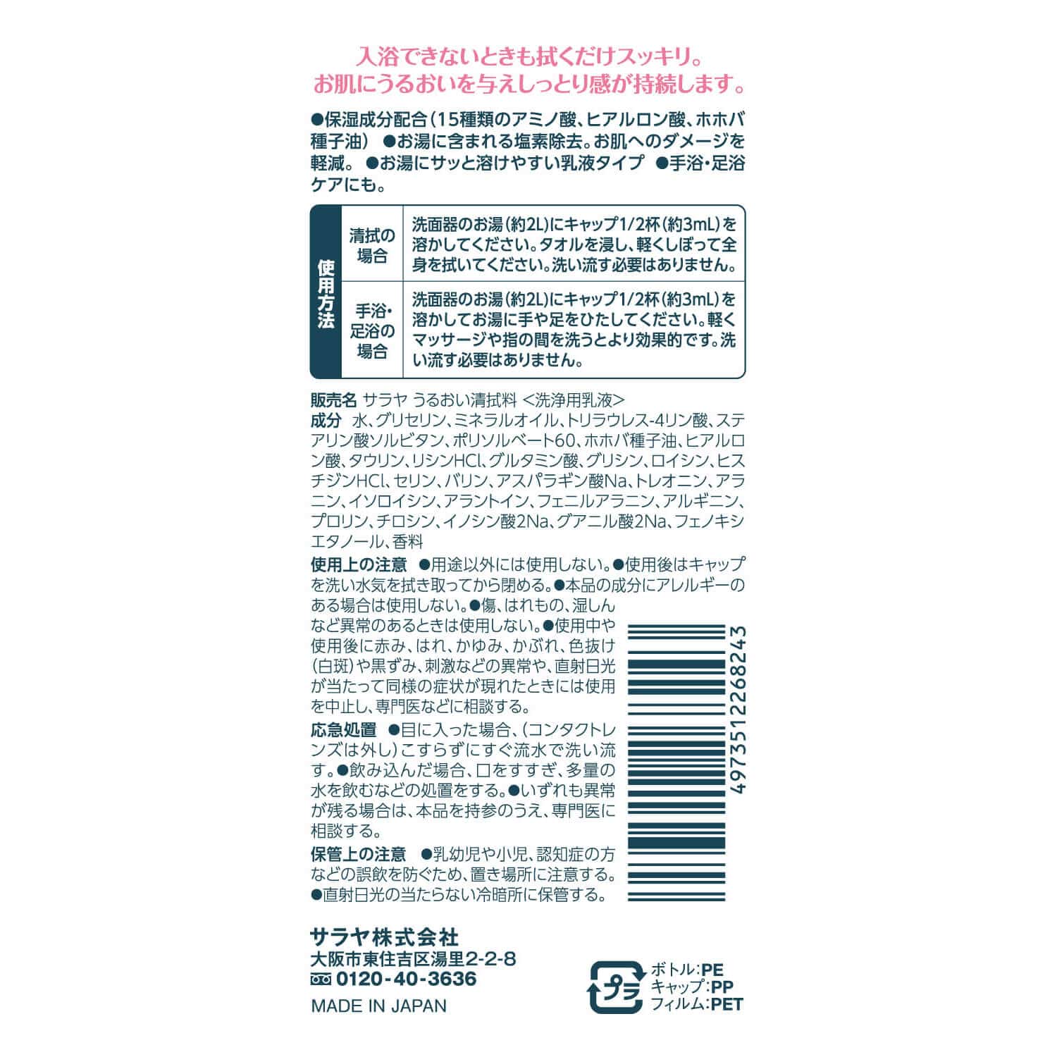| 販売名 | サラヤ うるおい清拭料 <洗浄用乳液> |