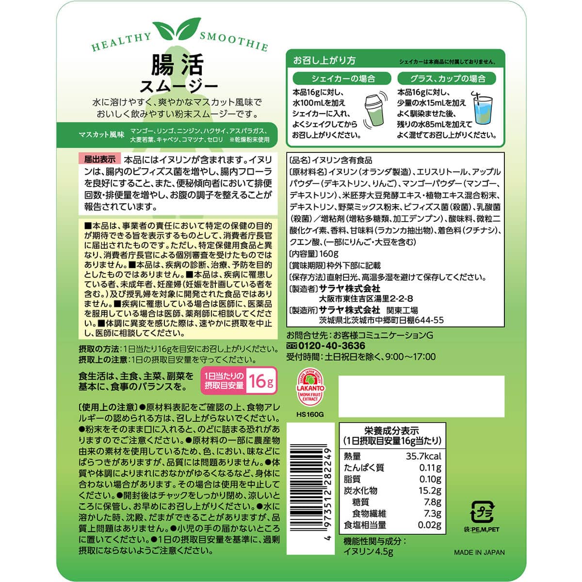 届出表示 | 本品にはイヌリンが含まれます。イヌリンは、腸内のビフィズス菌を増やし、腸内フローラを良好にすること、また、便秘傾向者において排便回数・排便量を増やし、お腹の調子を整えることが報告されています。 |