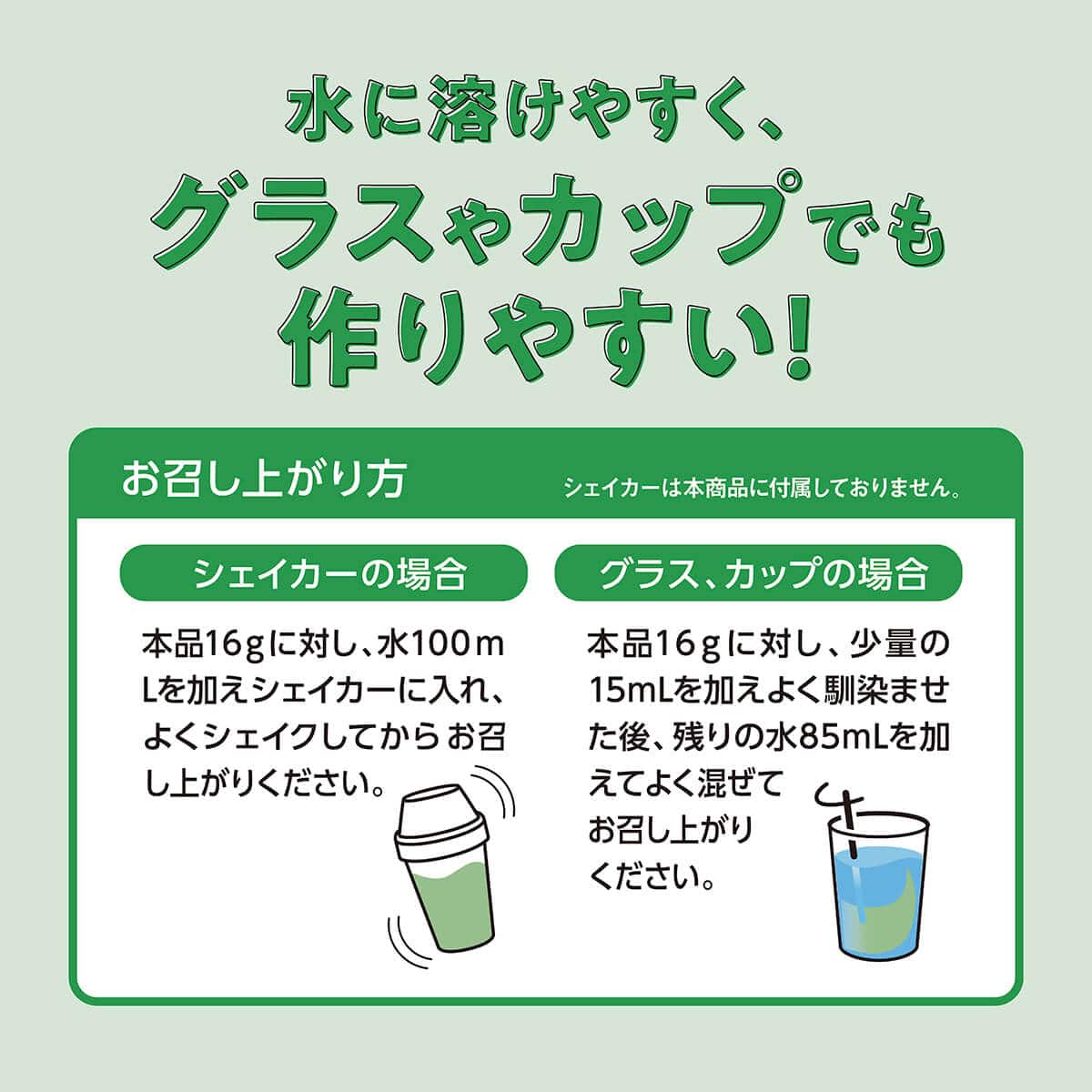 【シェイカーの場合】 本品16gに対し、水100mLを加えシェイカーに入れ、よくシェイクしてからお召し上がりください。 【グラス、カップの場合】 本品16gに対し、少量の水15mLを加えよく馴染ませた後、残りの水85mLを加えてよく混ぜてお召し上がりください。 シェイカーは本商品に付属しておりません。 |