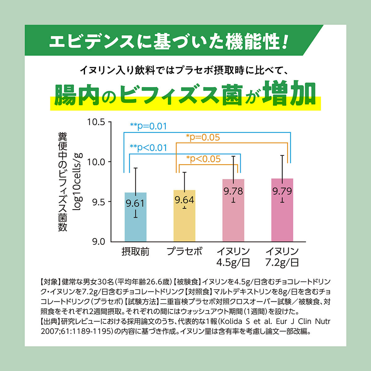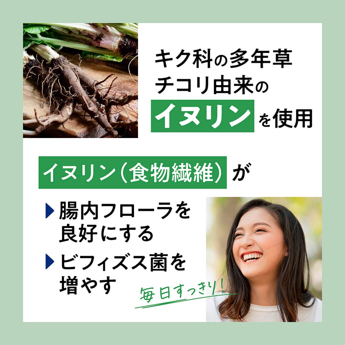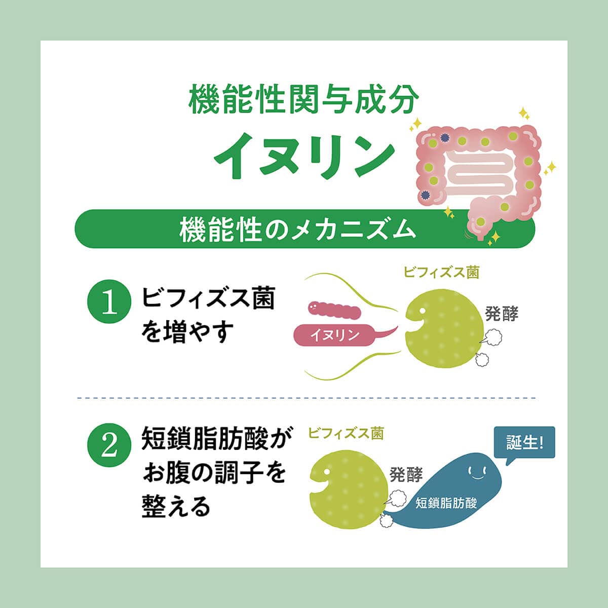 イヌリン(食物繊維)が腸内フローラを良好にし、ビフィズス菌を増やします。