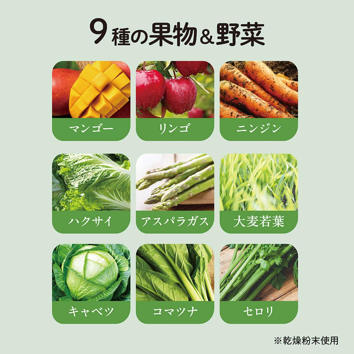 原材料名 | イヌリン(オランダ製造)、エリスリトール、アップルパウダー(デキストリン、りんご)、マンゴーパウダー(マンゴー、デキストリン)、 米胚芽大豆発酵エキス・植物エキス混合粉末、デキストリン、野菜ミックス粉末、ビフィズス菌(殺菌)、乳酸菌(殺菌)/増粘剤(増粘多糖類、加工デンプン)、 酸味料、微粒二酸化ケイ素、香料、甘味料(ラカンカ抽出物)、着色料(クチナシ)、クエン酸、(一部にりんご・大豆を含む) |