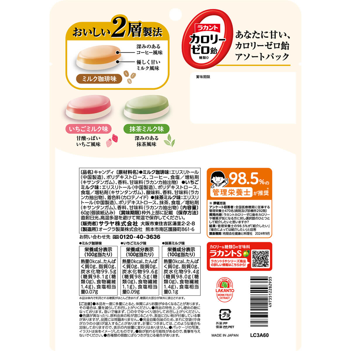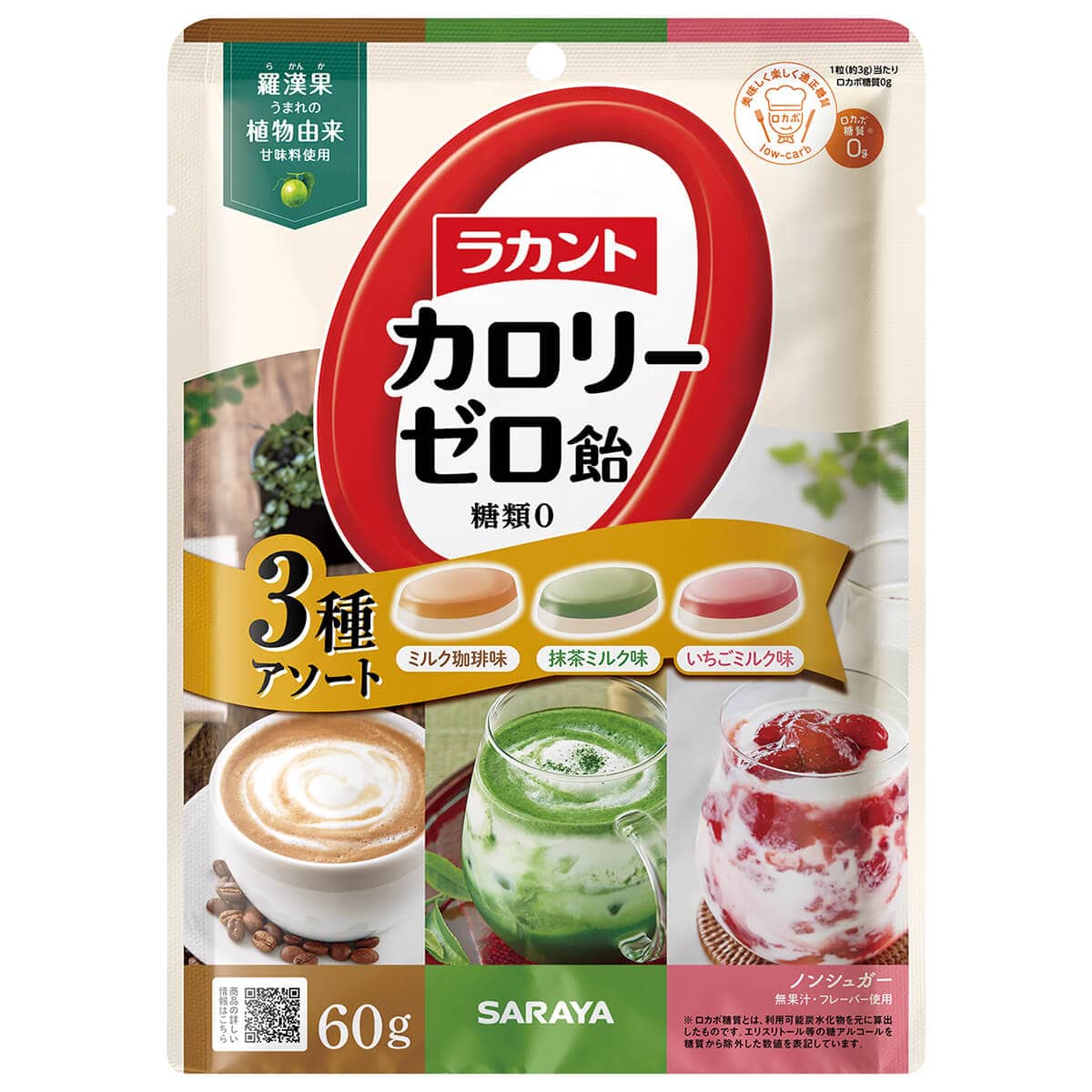 羅漢果(ラカンカ)のやさしい甘さでカロリーゼロ・糖類ゼロ、1粒(約3g)当たりのロカボ糖質0g。