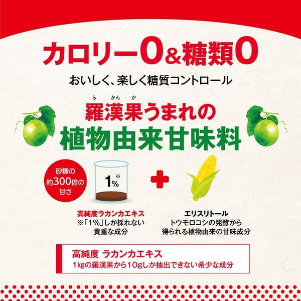 羅漢果の生果実からわずか1%ほどしか取れない砂糖の約300倍もの甘さをもつ高純度ラカンカエキス(ラカンカ抽出物)を、とうもろこし由来の「エリスリトール」と合わせた、カロリーゼロ・糖類ゼロの甘味料です。