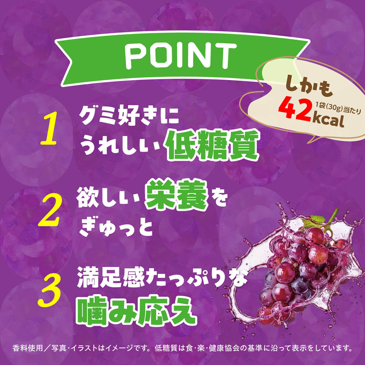 ①グミ好きにうれしい低糖質。しかも、1袋(30g)当たり42kcal。