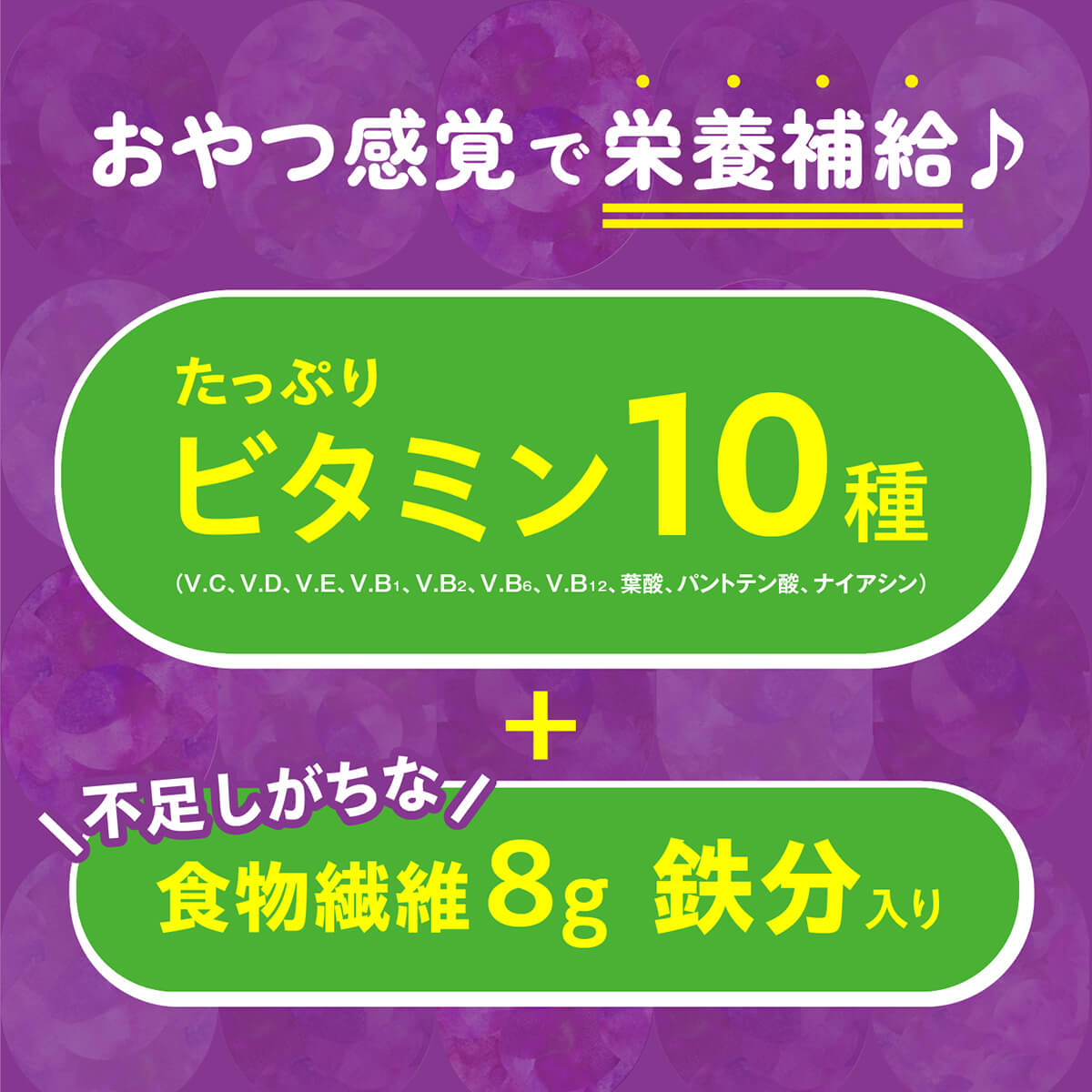 たっぷりビタミン10種(C、D、E、B1、B2、B6、B12、葉酸、パントテン酸、ナイアシン)。