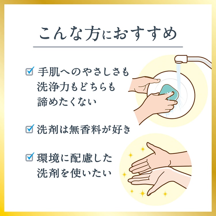 精製度の高い品質を証明する、無色透明の輝き。無香料、無着色で、食器に洗剤の香りうつりがありません。