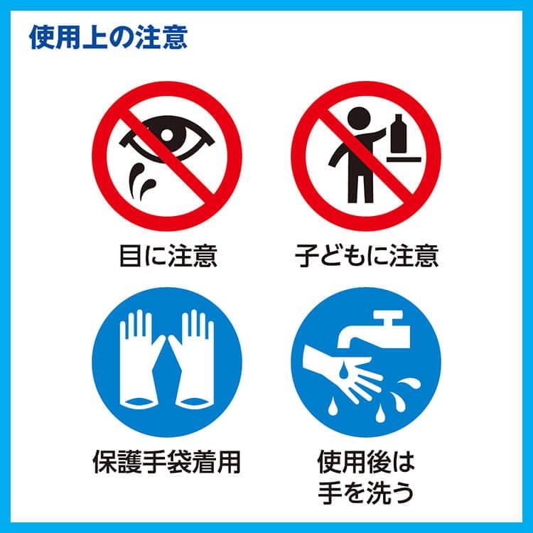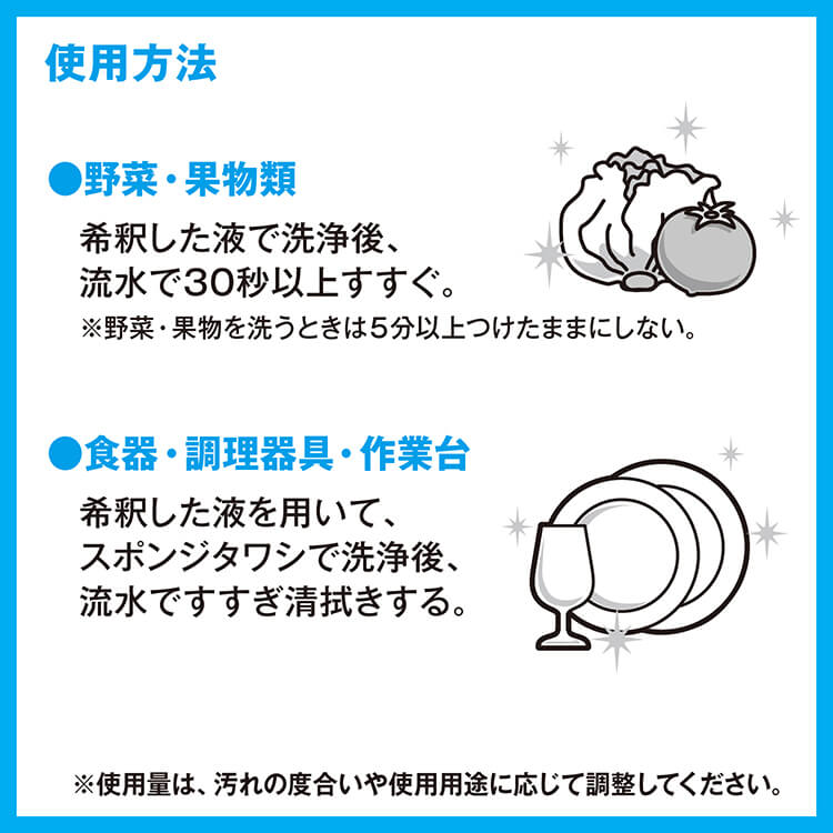 液で洗浄後、流水で30秒以上すすぐ。※野菜・果物を洗うときは5分以上つけたままにしない。