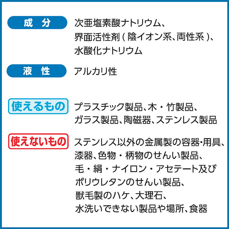 | 成分 | 次亜塩素酸ナトリウム、界面活性剤剤(陰イオン系、両性系)、水酸化ナトリウム |