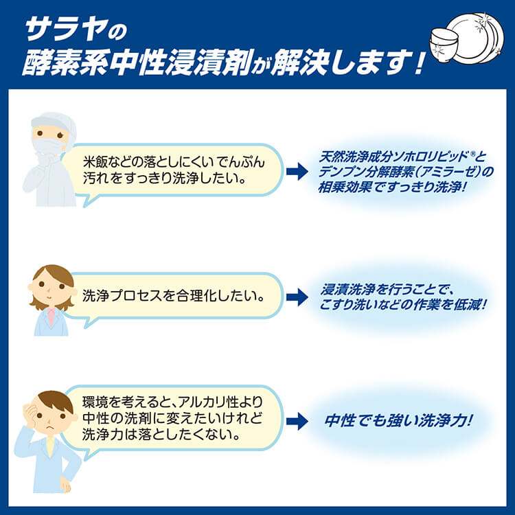 サラヤ酵素系中性浸漬剤は天然洗浄成分ソホロ※とデンプン分解酵素(アミラーゼ)の相乗効果で特にでんぷん汚れをよく落とします。