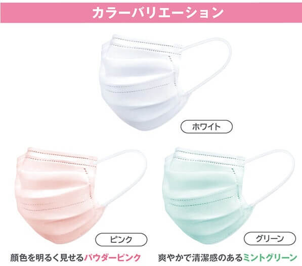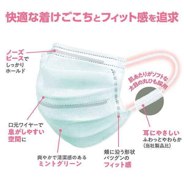 口元ワイヤーとオメガ形のプリーツで空間を維持し、呼吸のしやすさに配慮。