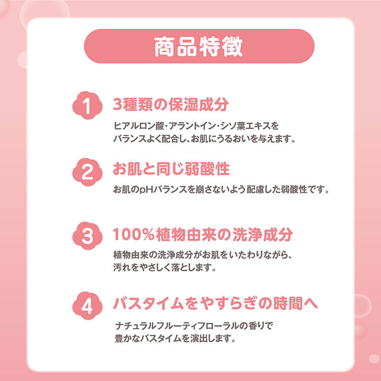 ナチュラルフルーティフローラルの香りで豊かなバスタイムを演出します。