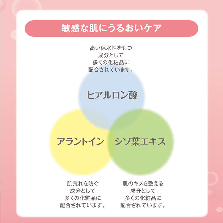 ヒアルロン酸・アラントイン・シソ葉エキスをバランスよく配合し、お肌にうるおいを与えます。