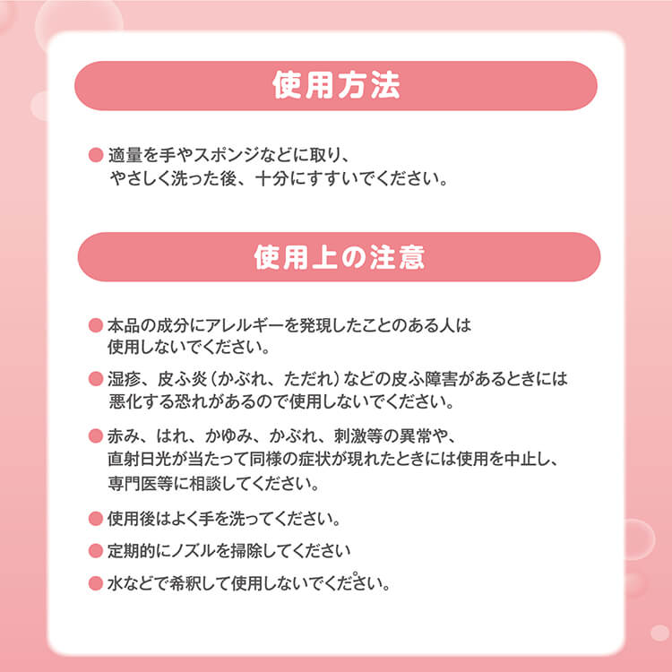 | 成分 | 水、ラウレス-100、ラウリルベタイン、DPG、ラウレス硫酸Na、グリセリン、ヒアルロン酸、アラントイン、シソ葉エキス、フェノキシエタノール、トコフェロール、クエン酸、安息香酸Na、EDTA-4Na、BG、香料 |