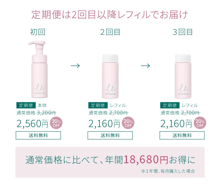定期便をお申込みいただくと初回は本体のお届け、2回目以降は環境に配慮したレフィルでのお届けとなります。