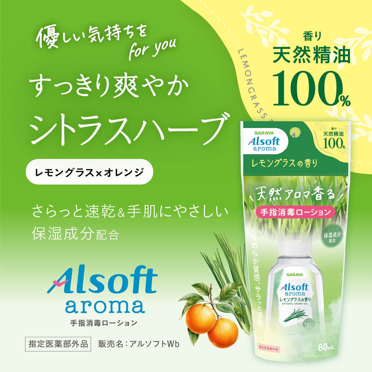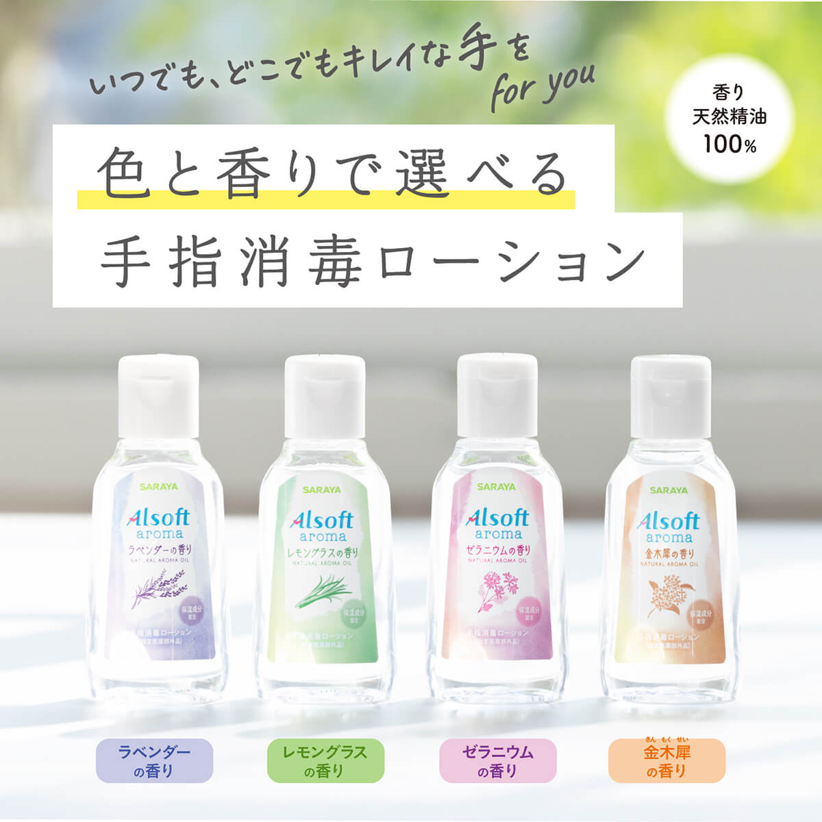 色と香りで選べる手指消毒ローション。天然精油100%のナチュラルな香り。