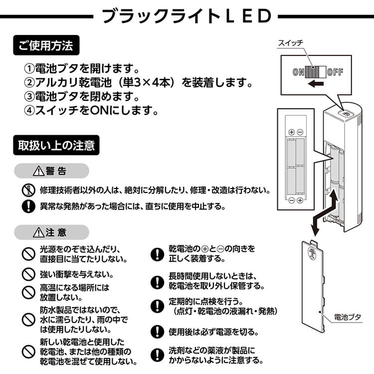 従来の蛍光管タイプのブラックライトと比べ、電池寿命は約4倍に伸びました。電池を頻繁に取り替える必要もなくなり、手間も省けます。