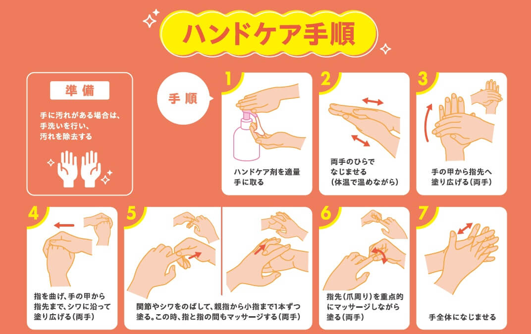医療現場で使用するハンドケア製品を選定する際は、「使用後にべとつかず作業に支障をきたさないこと」「手指消毒剤の残留抗菌作用に影響を与えないこと」「手袋の成分に影響を与えないこと」などを考慮することが重要です。 また、手荒れの要因は様々なため、ハンドケア製品の使用はもちろんですが、「手洗い時は温水を使用しない」「石けん成分は十分に洗い流す」「手洗い後はペーパータオルで水分をしっかり拭き取る」「速乾性アルコール製剤は保湿剤を含む製品を選択する」などの多面的な対策が必要です。