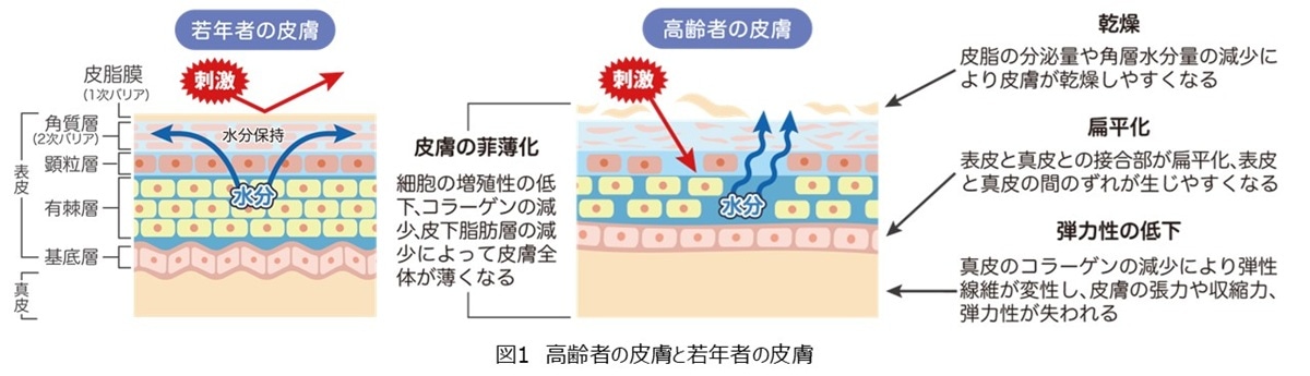 高齢者の皮膚は加齢に伴って薄くなり、皮脂の分泌量や角層の水分量が減少するため乾燥しやすくなります。 その結果、皮膚のバリア機能が低下し、ドライスキン(乾燥)、かゆみ、湿疹、スキンテア(皮膚の裂傷)、褥瘡(床ずれ)、およびIAD(Incontinence Associated Dermatitis:失禁関連皮膚炎)など、さまざまなスキントラブルが起こりやすくなります。 スキントラブルの発生は、高齢者のQOL(生活の質)を大きく損なう要因にもなります。