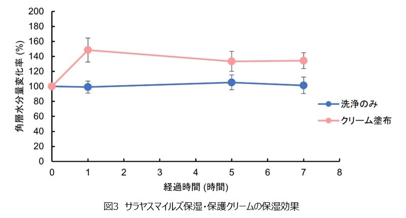サラヤスマイルズ薬用洗浄料で洗浄した後に、サラヤスマイルズ保湿・保護クリームを塗布し、1時間、5時間、7時間後の角層水分量を測定しました。 その結果、サラヤスマイルズ保湿・保護クリームを塗布した群では、洗浄のみ行った群と比較して、角層水分量が高い状態で維持されており、保湿効果が持続することが確認されました。