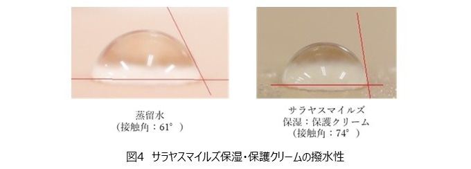 人工皮膚モデルであるバイオスキンに蒸留水またはサラヤスマイルズ保湿・保護クリームを塗布後、その上に水を20 μL 滴下し、バイオスキンと水滴との接触角を測定しました。 その結果、サラヤスマイルズ保湿・保護クリームを塗布した場合は、蒸留水を塗布した場合と比べて接触角が大きくなり、撥水性が高いことが示されました。