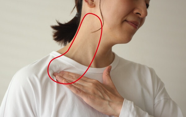 2. 鎖骨のすぐ下に指を当て、下から上へ流すようにくるくるとほぐします。