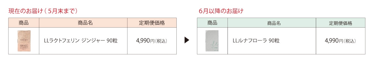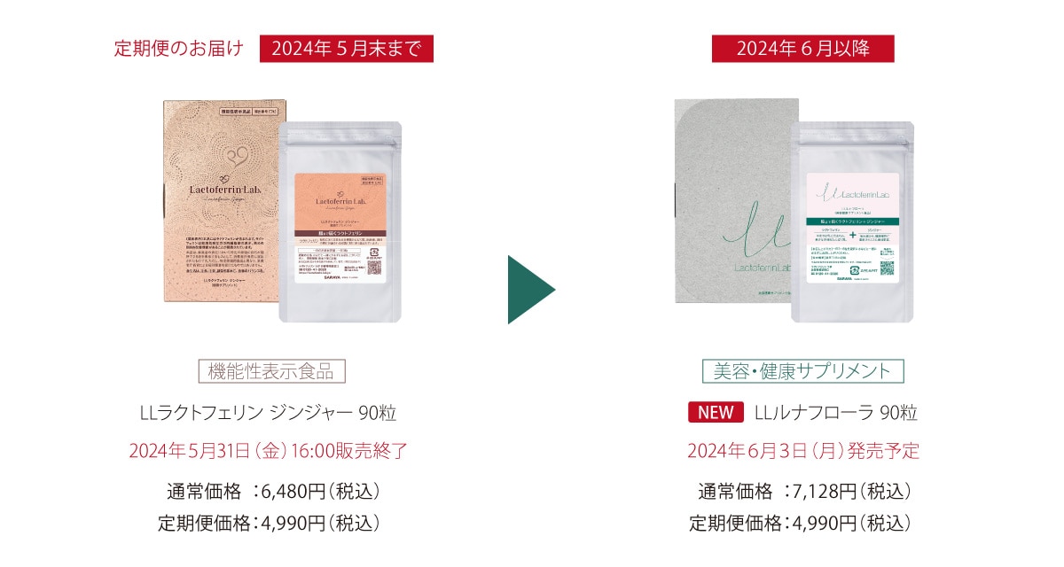 定期便で「LLラクトフェリン ジンジャー」のお届けは5月末までとなり、 6月以降は後継品である新商品「LLルナフローラ」のお届けとなります。 一部発送の都合上、お届け商品の切り替えが前後する可能性もございますことご了承ください。