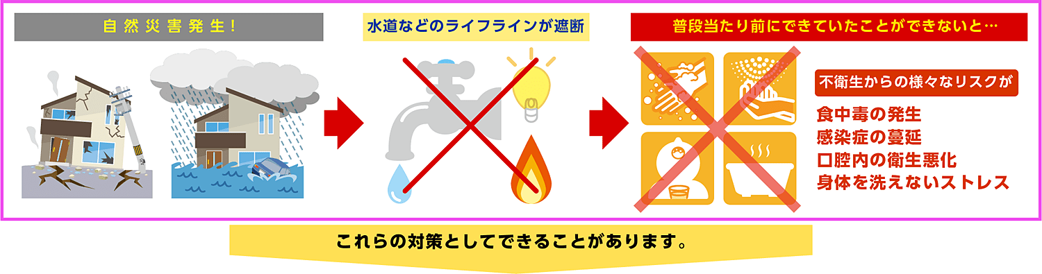 自然災害発生の際、断水や停電などから通常の感染症対策がしにくく、さらに非常事態によるストレスから感染症を発症するリスクが高くなります。