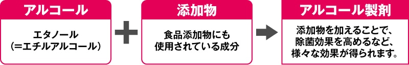 食品衛生の分野で使用するアルコール製剤は食品用アルコールに添加物等を加えて作られます。また、アルコール製剤自体が「食品添加物」の許可を得ている製剤であればより安心してご利用いただけます。
