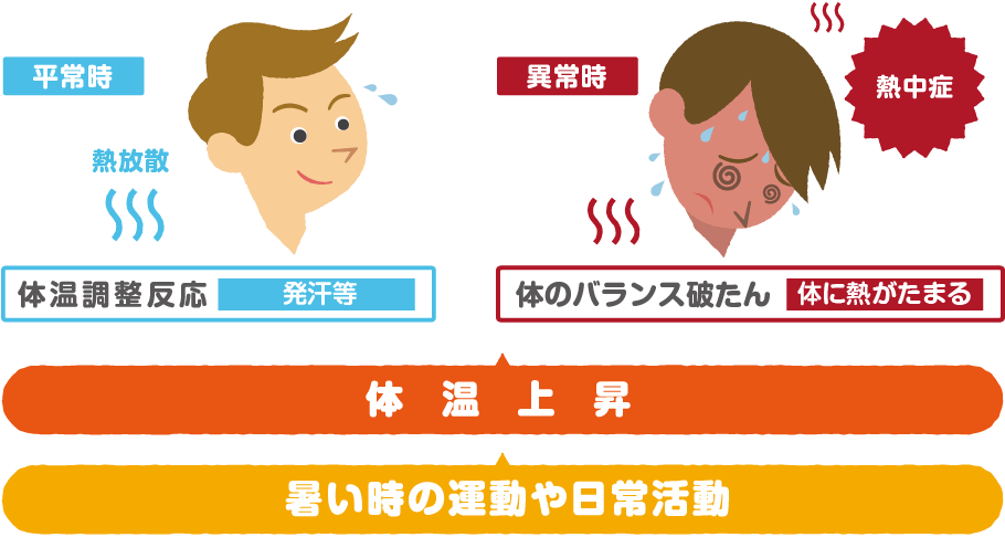 人間の身体は、平常時は体温が上がっても汗や皮膚温度が上昇することで体温が外へ逃げる仕組みとなっており、体 温調節が自然と行われます。しかし、これら3つの要因により、体温の上昇と調整機能のバランスが崩れ、身体に 熱が溜まってしまいます。このような状態が熱中症です。