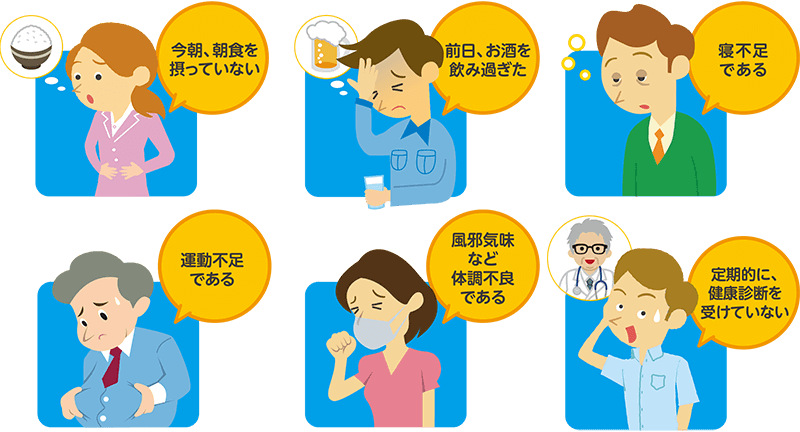 「からだ」の要因は、高齢者や乳幼児、肥満、二日酔いや寝不足といった体調不良、脱水状態などがあります。