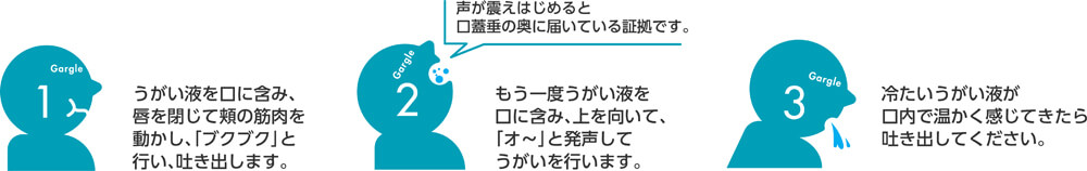 上を向いて喉の奥を洗浄する「オ~」と発生するうがいで、喉周辺を効果的に洗浄することができます。